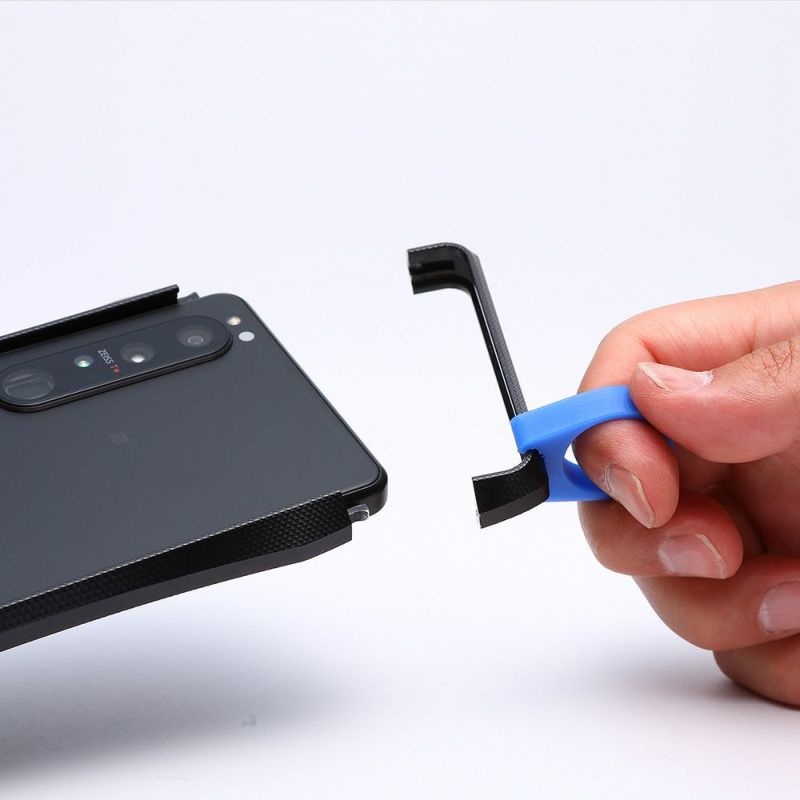 バンパーと一体成形された特殊形状のフックパーツと精密に調整されたカバーパーツを組み合わせて固定します。iPhoneに装着をするとガタ付きもなくピッタリと固定されるこれらの超精密加工は、台湾の協力工場でブラッシュアップされ、見事なまでの一体感を実現しています。バンパーの脱着がやりにくい際に補助となるリムーバーツールが付属となっています。
