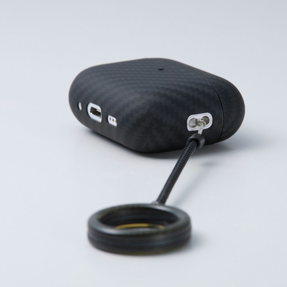 ケースの装着には両面テープや接着材などを一切使用しない完璧なフィット設計です。アラミド繊維は電波を通す素材なので、MagSafe充電器を用いたワイヤレス充電はもちろん、iOSの「探す」アプリにも対応しています。MagSafe充電ケース背面のペアリングスイッチは静電タッチ仕様に変わりましたが、もともと使用頻度が非常に少ないため本モデルではあえて開口処理をしていません。よりスムーズな一体感を実現しました。