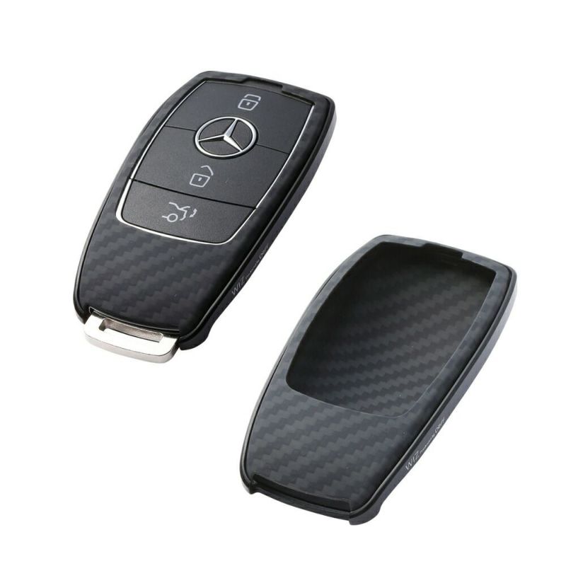 メルセデス・ベンツの最新モデルに採用されている「リモコンキー」に対応しています。オリジナルの独特な形状をスポイルすることなく、各部の複雑な形状もアラミド繊維の成形でフィットさせています。また、AMGシリーズ向けに背面のメダリオンが露出する仕様も別途ラインナップしました。外周はアルミニウムを削り出して成形したバンパーでしっかりとガードします。