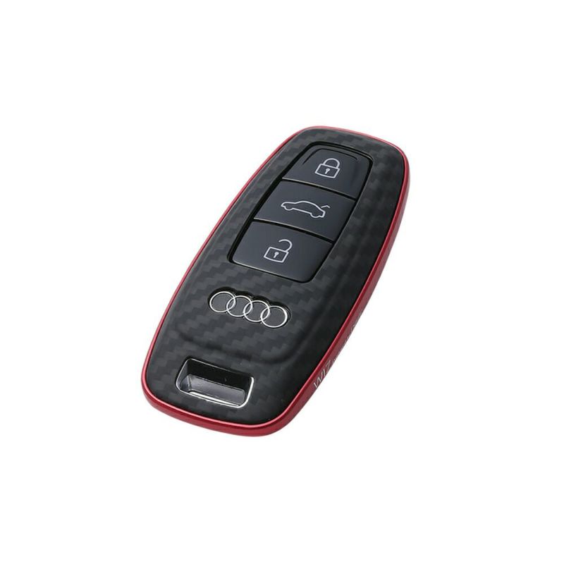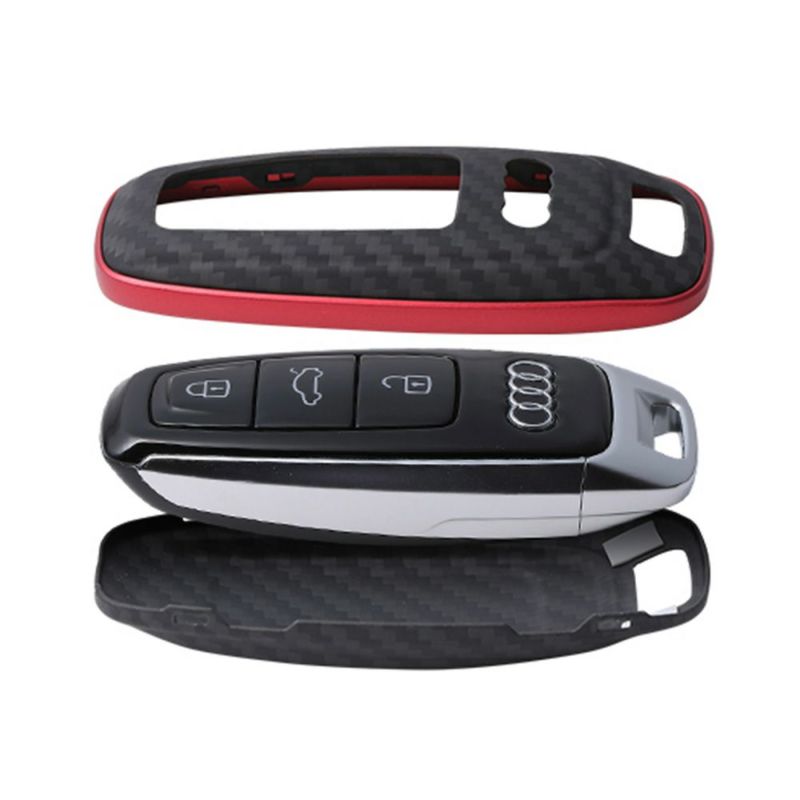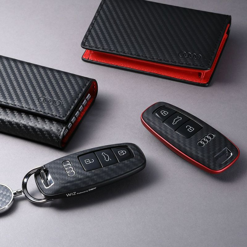 現行Audiの最新モデルに採用されている「Audiアドバンストキー」に対応しています。オリジナルの独特な形状をスポイルすることなく、各部の複雑な形状もアラミド繊維の成形でフィットさせています。外周はアルミニウムを削り出して成形したバンパーでしっかりとガードします。