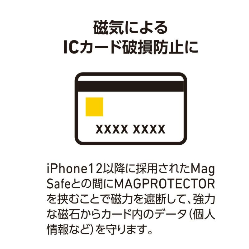 iPhone 12以降に採用されたワイヤレス充電「MagSafe」ですが、強力な磁石によりクレジットカードやキャッシュカードを近づけるとカードを破損する場合があります。MAGPROTECTORを間に挟むことで磁力を遮断するので非接触ICカードを守ります。