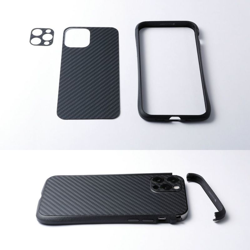 また、背面を保護するアラミド繊維製(デュポン製ケブラー)のカバープレートを同梱しました。バンパーと組み合わせる事で一体感が高まり、擦り傷などがからiPhoneの背面ガラスを保護します。アラミド繊維はNFCやワイヤレス充電に影響しませんので、Apple PayやMagSafe充電が可能です。