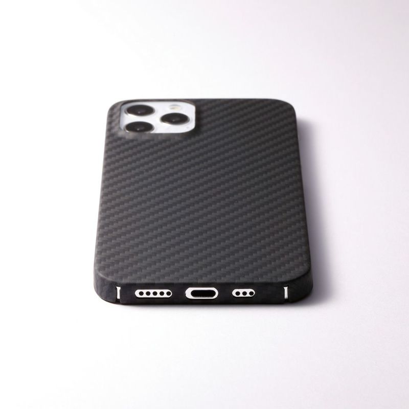 外周すべてを保護する精密成型と、スピーカーホール周りをくり貫く微細加工が施されており、アラミド繊維の特徴を活かした「DURO」は軽量かつ強靭。マット仕上げで、特殊コーティングにより滑らかで手にしっとり馴染む肌触りも実現しています。また、アラミド繊維の織り目を活かしつつ、iPhoneそれ自体の機能美溢れる美しさを際立たせるシンプルで美しい仕上がりになっています。大きなiPhoneでも持ちやすいようにストラップを取り付けることも可能です。もちろん、装着していても通話やモバイルSuicaの使用に影響はありません。