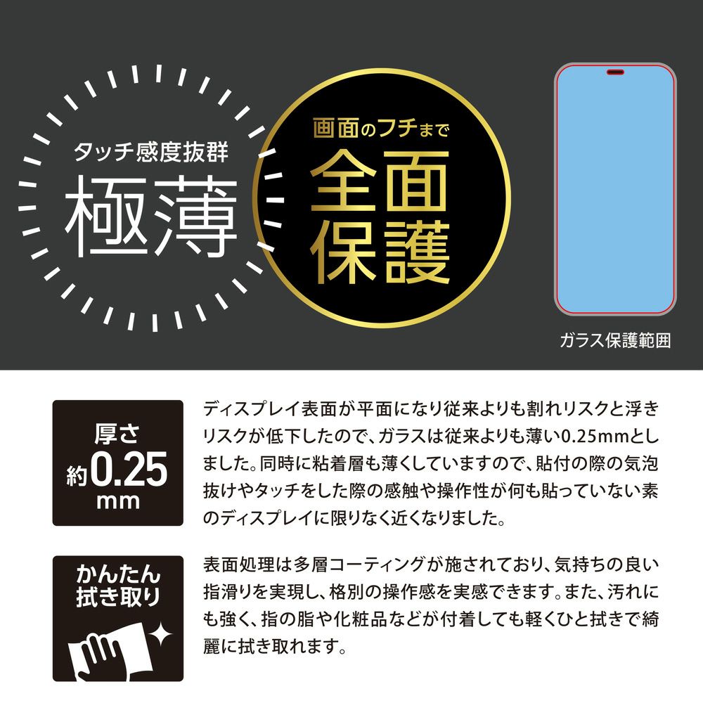 他の画像を見る iPhone 13mini用, 16e/14/13/13Pro共用, 13ProMax用 全画面保護 ガラスフィルム 気泡が残りにくい柔軟性のある極薄ガラス 透明・高光沢 メール便可 High Grade Glass Screen Protector for iPhone13 Series (透明・高光沢) 店内全品 ポイント10倍! 通常販売価格 ¥ 1,180 (税込) ¥ 800 税込 お気に入りに登録する