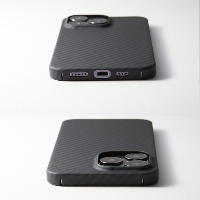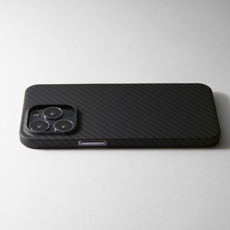 同質量の鋼鉄よりも5倍強く、ガラス繊維の半分の軽さという「アラミド繊維」。その中でも世界トップブランドの米国デュポン社製 ケブラー(R)を贅沢に使った特別なケースです。iPhoneのディテイルとほぼ同じ形状を踏襲し、装着しても本体がケース太りしません。装着していることすら忘れる約0.6mmの薄さとiPhone 13で約11gという軽さを誇ります。