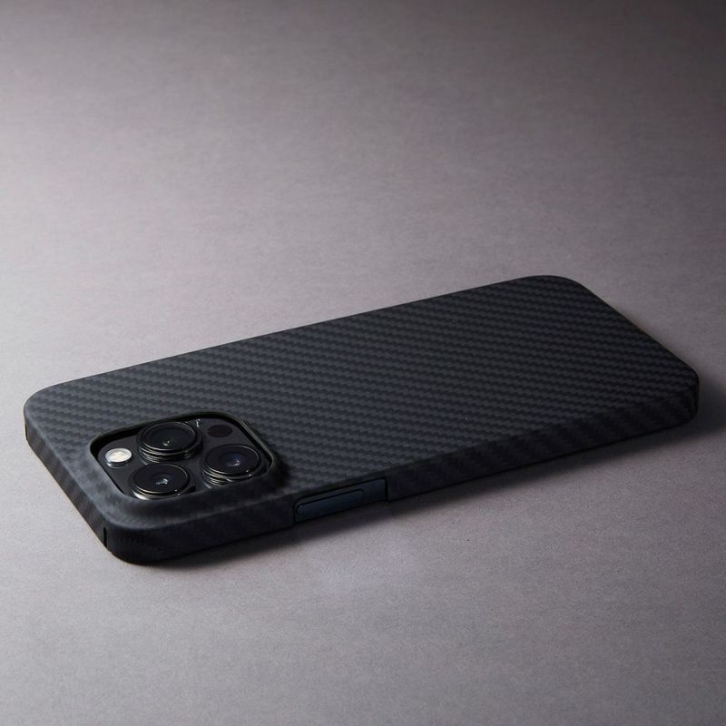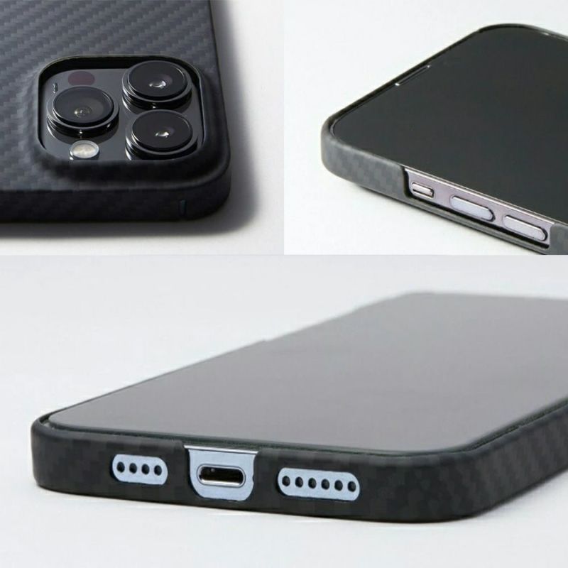 同質量の鋼鉄よりも5倍強く、ガラス繊維の半分の軽さという「アラミド繊維」。その中でも世界トップブランドの米国デュポン社製 ケブラー(R)を贅沢に使った特別なケースです。iPhoneのディテイルとほぼ同じ形状を踏襲し、装着しても本体がケース太りしません。装着していることすら忘れる約0.65mmの薄さとiPhone 14 Proで約11.5gという軽さを誇ります。