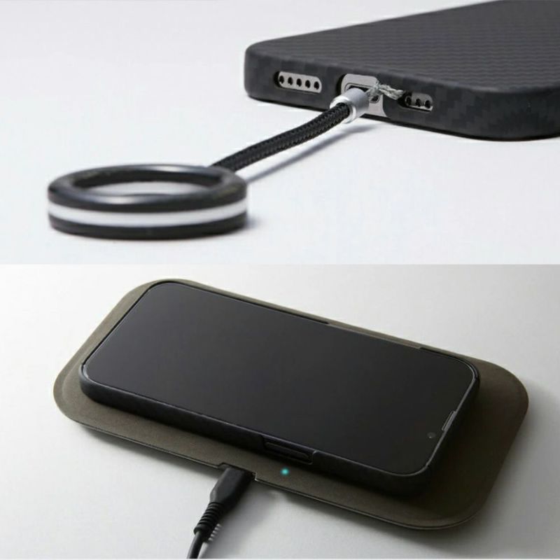 表面にはコーティングが複数回処理されており、サラリとした肌触りと汚れの付きにくい防汚処理で常に清潔な状態を保てます。カーボンファイバーを思わせる美しい織目も高級感を感じさせます。4G, 5Gを含む全てのデータ通信、通話、ワイヤレス充電、Apple Pay、モバイルSuicaなどへの影響はありません。