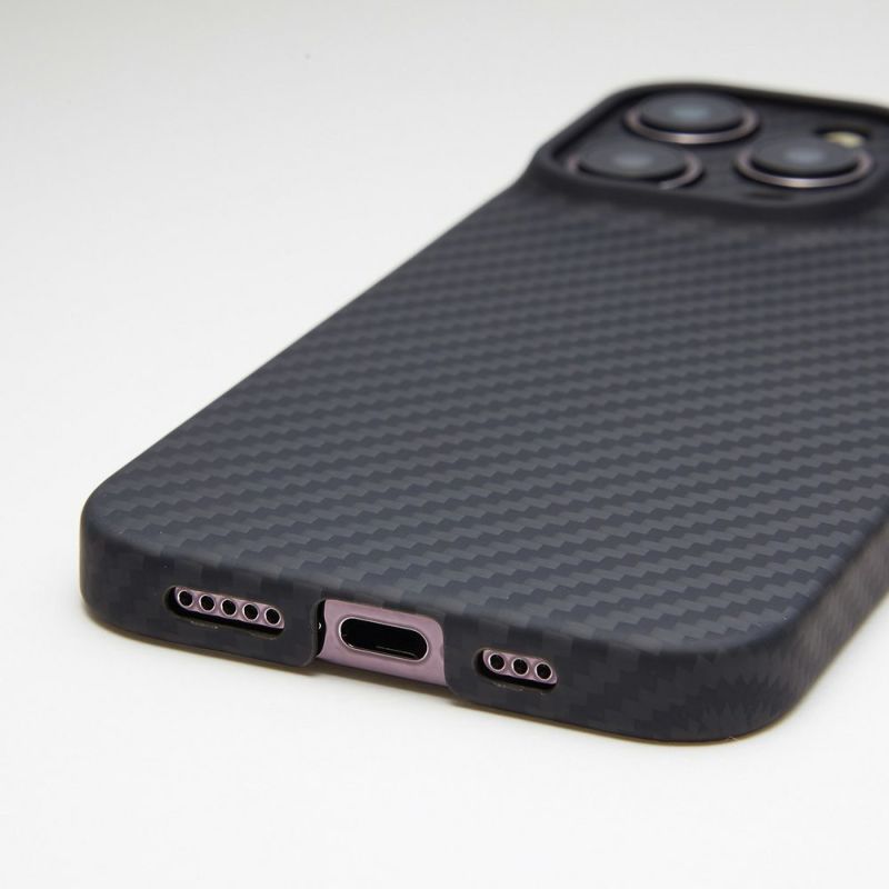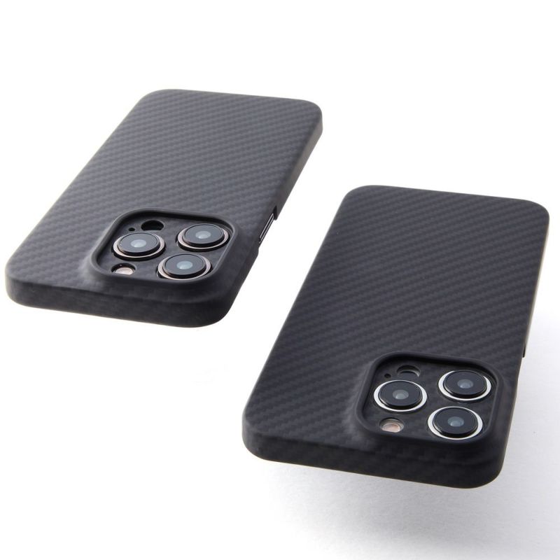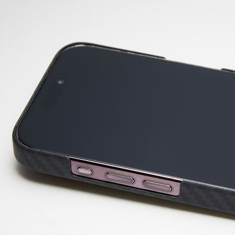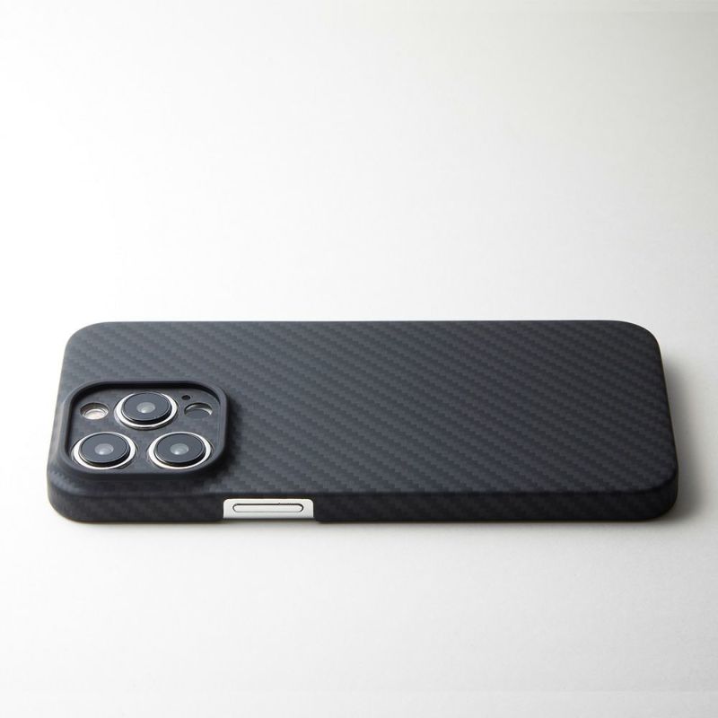 同質量の鋼鉄よりも5倍強く、ガラス繊維の半分の軽さという「アラミド繊維」。その中でも世界トップブランドの米国デュポン社製 ケブラー(R)を贅沢に使った特別なケースです。角が絶妙にラウンドしたiPhone 15 Proシリーズのボディ形状にフィットする緻密な成形は装着をすれば自然と一体化します。その製造工程はドライカーボンファイバーとほぼ同じ工法で製造されています。