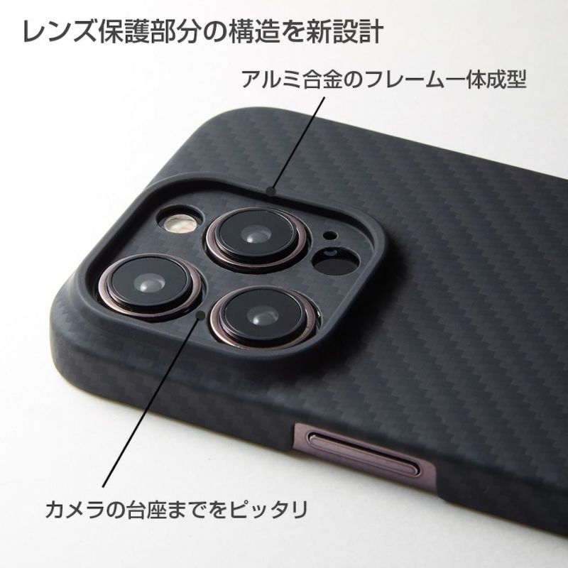 Special Editionではカメラの開口部を新設計しました。14 Proよりも大きく飛び出したレンズには、アラミドで全てを覆わずにカメラの台座までをピッタリと成形し、レンズの鏡筒部はアルミ合金のフレームを加えてガードしました。これによりケース全体の肥大感を低減してスッキリとした外観にまとめています。