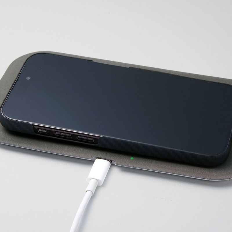 アラミド繊維の特徴を活かしてケースは軽量かつ強靭。さらに、アラミド繊維の織り目や、特殊コーティングにより滑らかで手にしっとり馴染む肌触りも実現。マット仕上げ。特徴的なiPhoneのスタイルを際立たせるシンプルで美しい仕上がりになっています。データ通信、通話、ワイヤレス充電、Apple Pay、モバイルSuicaなどへ使用上の影響はありません。