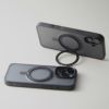 PC(ポリカーボネート)とTPU(熱可塑性ポリウレタンエラストマー)で構成されたケースの背面に薄型のリングを内蔵しました。リングはフィンガーリング、スタンド、MagSafeリングとして使うことができます。リングのベース部は360度自由に回転できるギア+ラッチ構造で、回す度にカチカチとクリック感があります。リング本体も120度まで起こせますので、フィンガーリングやスタンドとして活用できます。