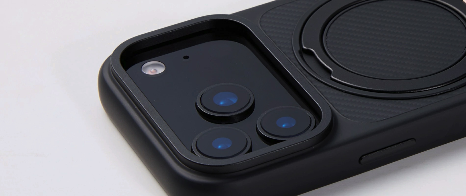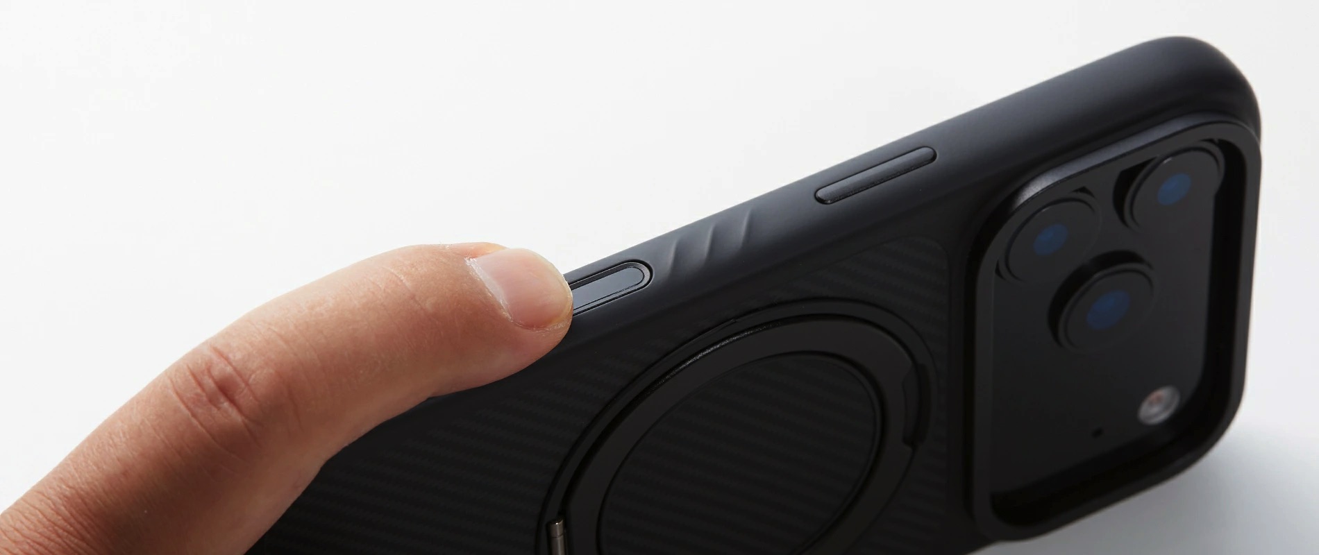 背面にはアラミド繊維を貼付、強度と質感を向上させています。側面のTPUは全方向をカバーする構造で、ボタン部分は別パーツを埋め込んで操作感を高めています。カメラコントロール部には、高感度パーツを採用することで、指先でのスライド、シャッター操作も快適に行えます。TPU内側は衝撃を吸収する形状デザインとなっており、保護性能は米国国防総省が軍採用品で確認する厳格な基準のひとつであるMIL規格(MIL-STD-810H)に準拠したテストにクリアしています(※1)。