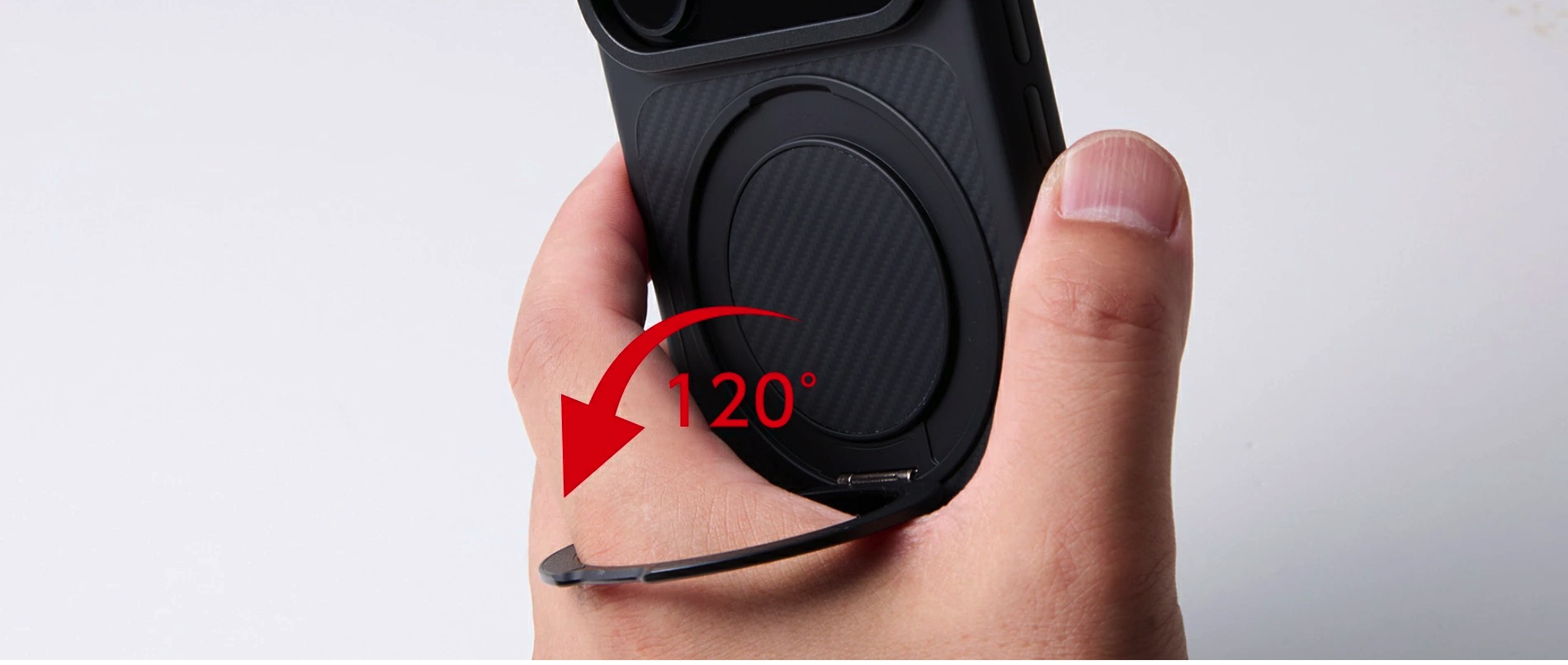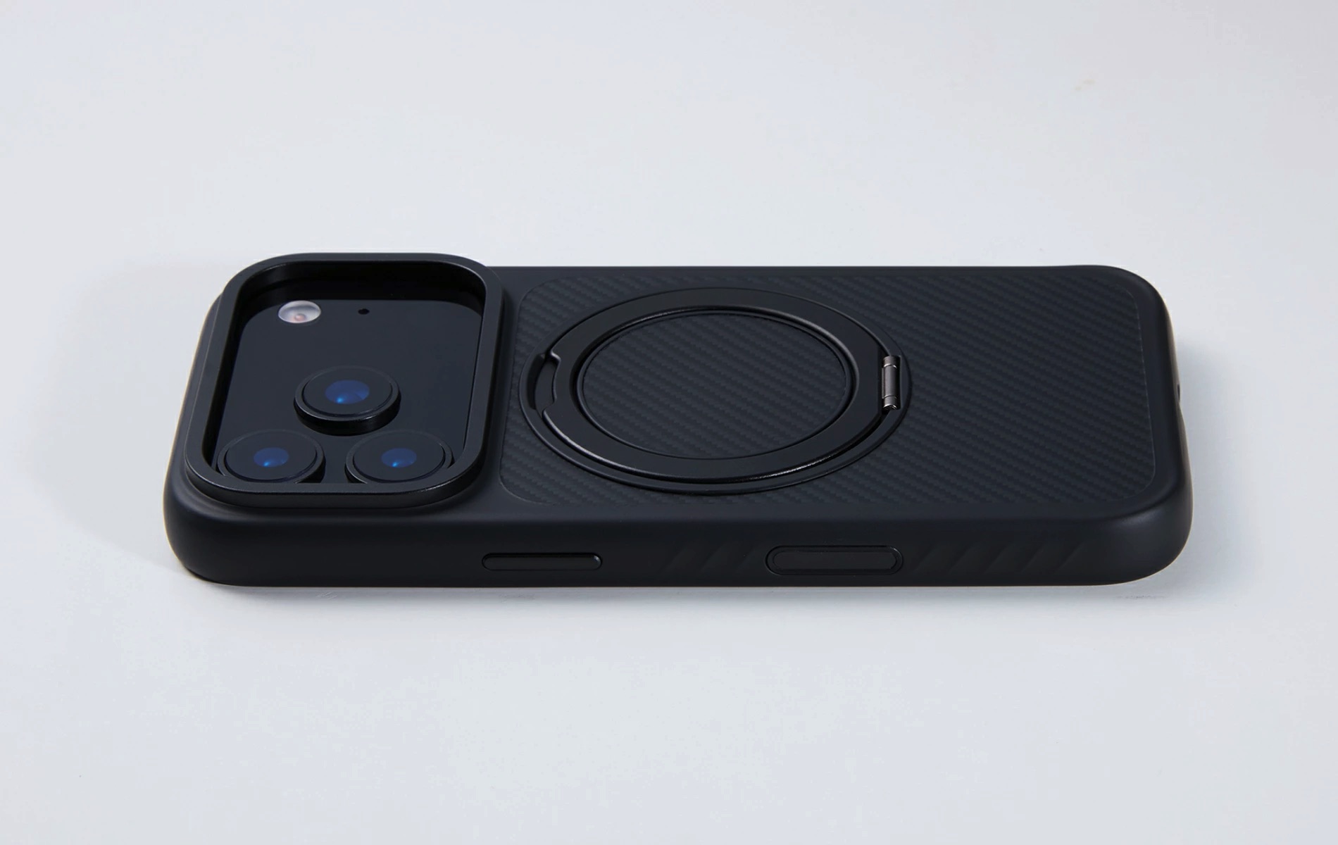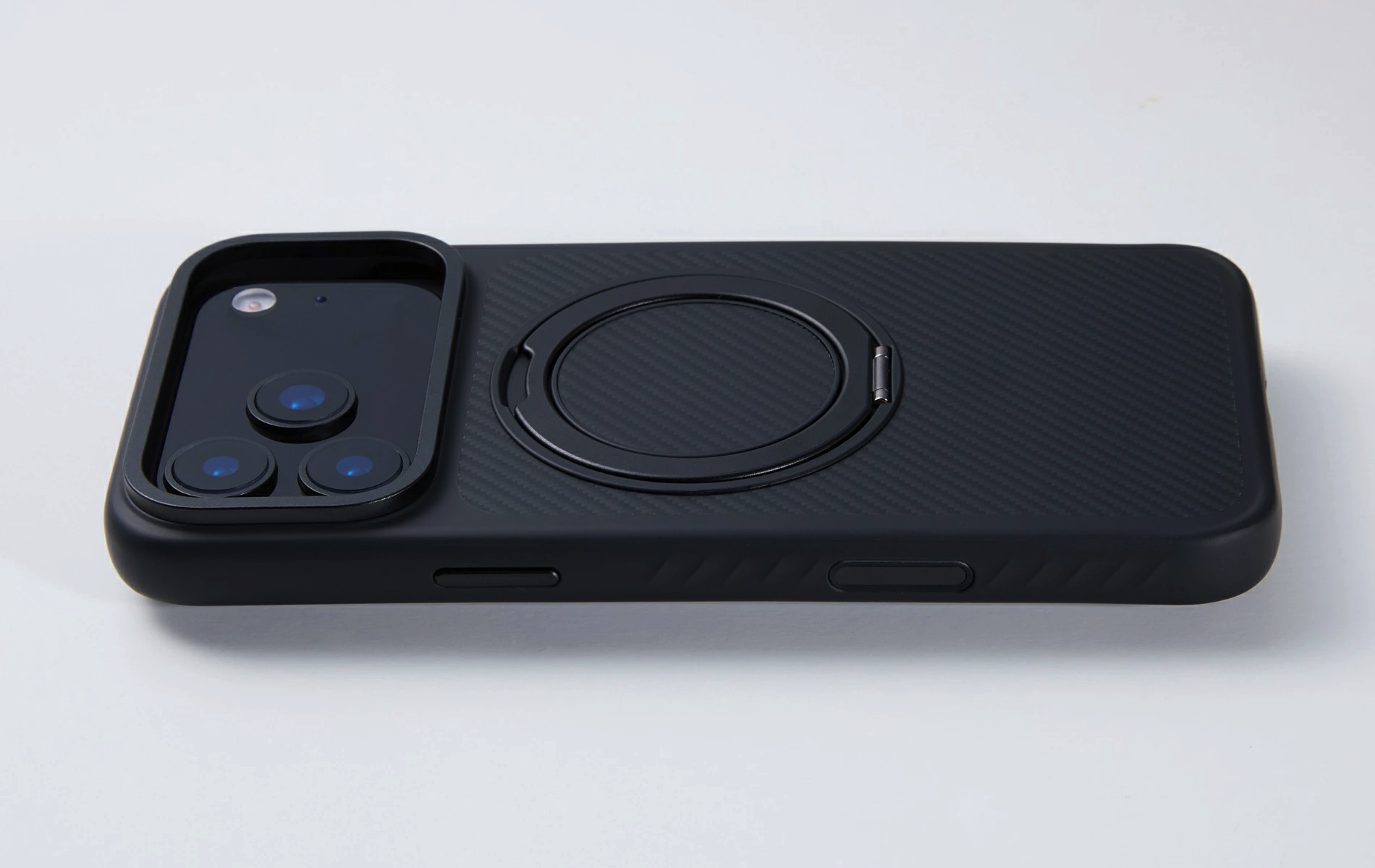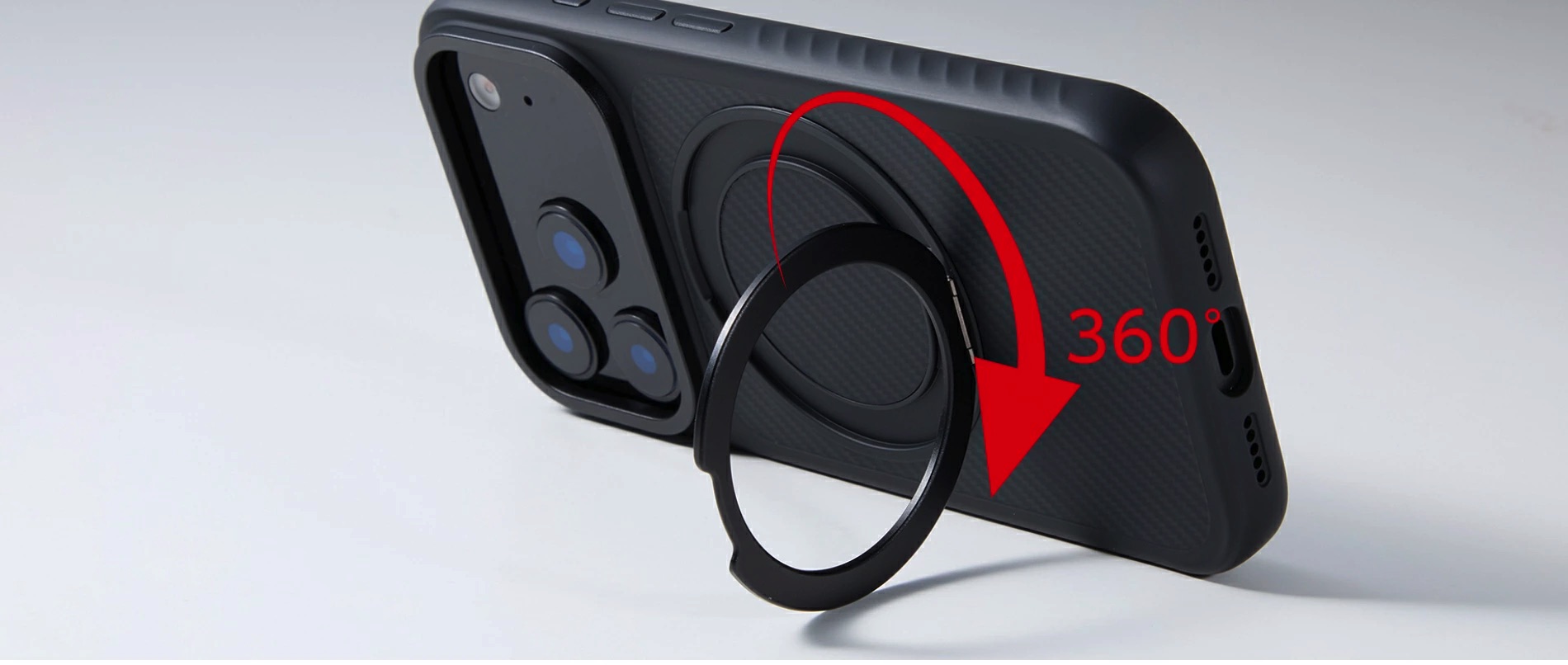PC(ポリカーボネート)とTPU(熱可塑性ポリウレタンエラストマー)で構成されたケースの背面に薄型のリングを内蔵しました。リングはフィンガーリング、スタンド、MagSafeリングとして使うことができます。リングのベース部は360度自由に回転できるギア+ラッチ構造で、回す際にはカチカチとクリック感があります。リング本体も無段階で120度まで起こせますので、フィンガーリングやスタンドとして活用できます。