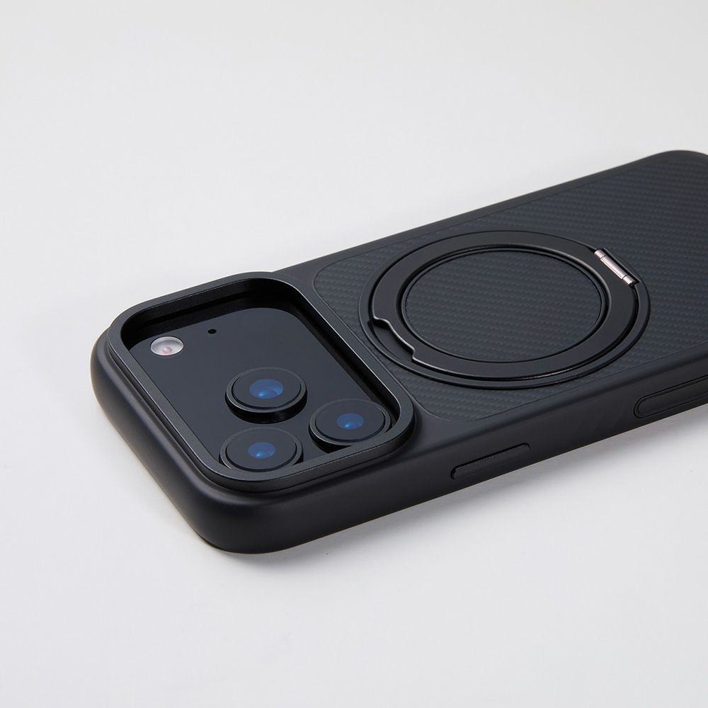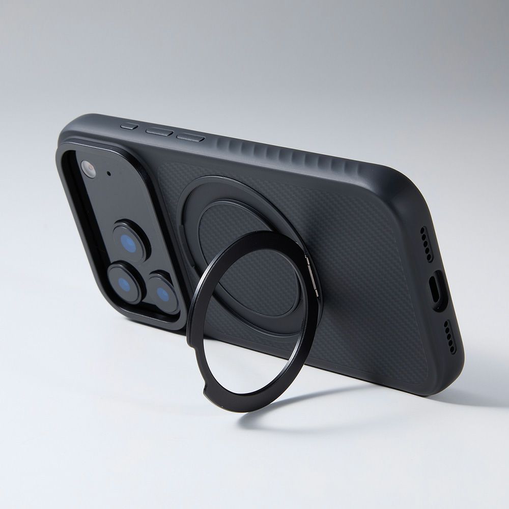 PC(ポリカーボネート)とTPU(熱可塑性ポリウレタンエラストマー)で構成されたケースの背面に薄型のリングを内蔵しました。リングはフィンガーリング、スタンド、MagSafeリングとして使うことができます。リングのベース部は360度自由に回転できるギア+ラッチ構造で、回す際にはカチカチとクリック感があります。リング本体も無段階で120度まで起こせますので、フィンガーリングやスタンドとして活用できます。