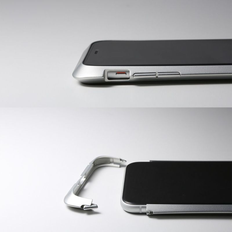 バンパーの内側には厚さ0.5mmのシリコンが組み込まれており、外部からの衝撃をiPhoneに直接伝えない構造です。厚みのあるシリコンは外側から見えない様に、バンパーの内側に切削加工された凹みに埋め込むという手の込んだ作りになっています。液晶面および背面カメラ面を保護する厚みを持たせ、万が一の落下からも最大限に保護をします(※2)。