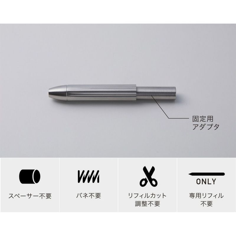 ⼤量⽣産された筆記具の多くは、リフィルと本体の嵌め合いに余裕があるので、書く際にペン先が揺れてしまいます。これでは思った通りに書けずに書かれた⽂字がブレてしまいます。本製品は固定⽤アダプタでカッチリとリフィルを固定し、ブレを無くし思った通りに書きやすくします。