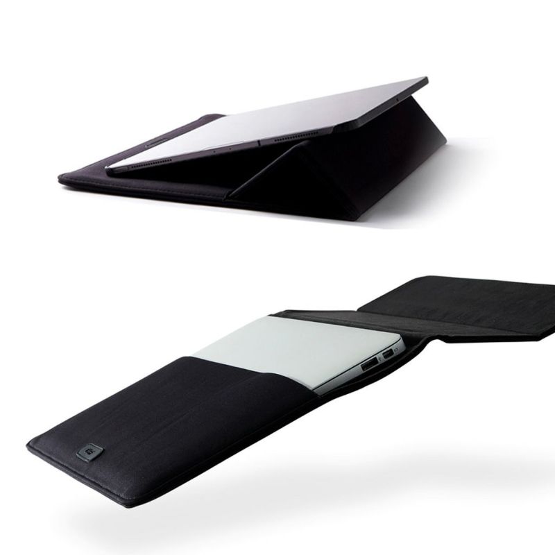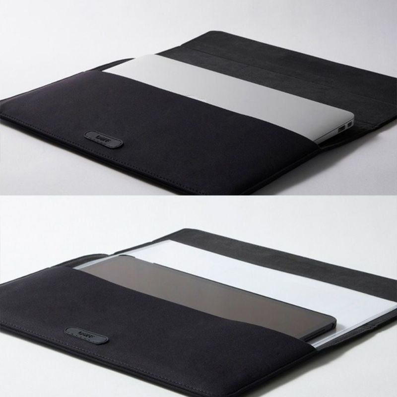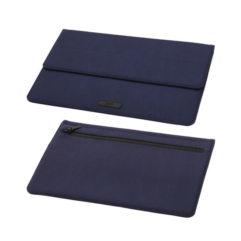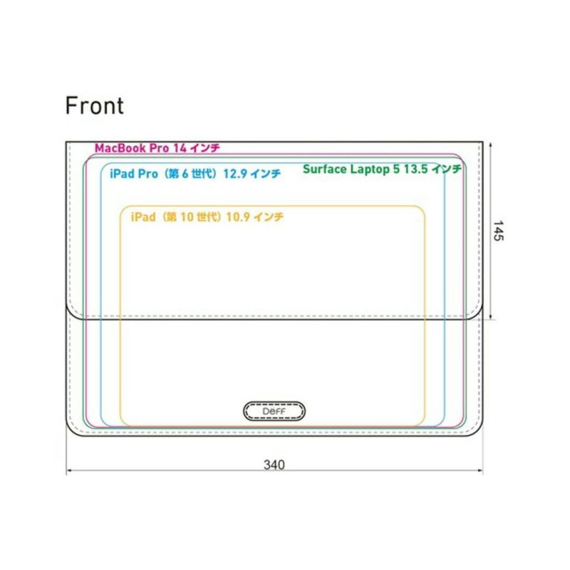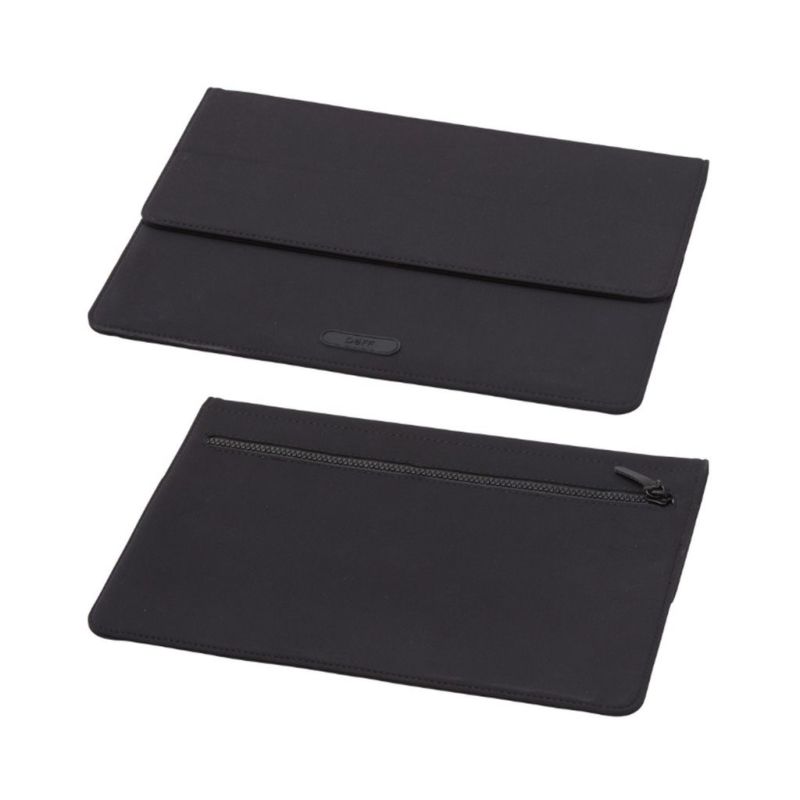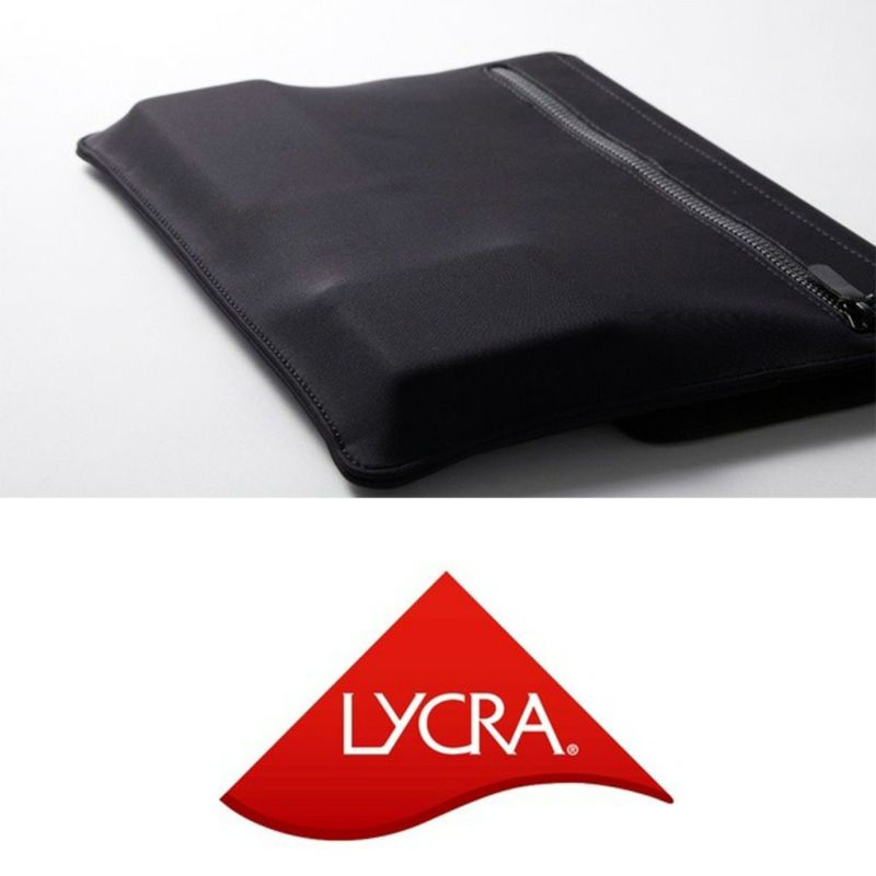 シンプルな封筒タイプの形状は、13インチクラスのノートPCやタブレットを収納できます。開閉部はフラップタイプでマグネットにより固定されます。主素材にはストレッチ素材のライクラ®ファイバー(※)を使用しています。