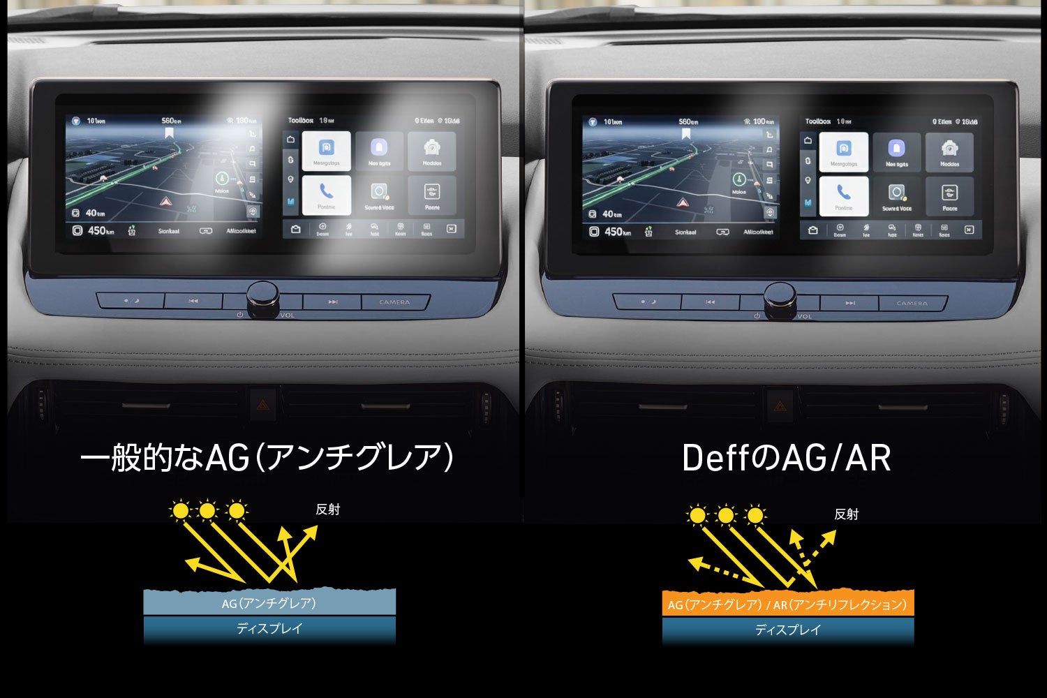 日産リーフの特徴である、メーターパネルとナビゲーションが一体となった美しい大型ディスプレイ。しかし、画面が大型化するほど「日差しの映り込みで見えにくい」「タッチ操作による指紋汚れが目立つ」という課題も大きくなります。 Deffは、これらEV特有の悩みを解決するため、スマートフォンアクセサリー開発で培った技術を結集。リーフの先進的なインテリアを損なわない、専用設計の保護フィルムを開発しました。