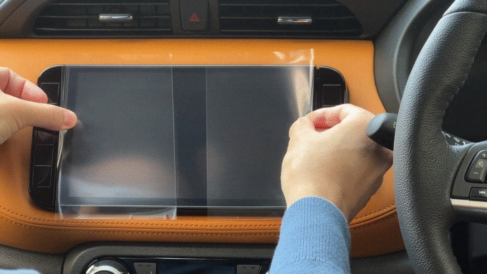 割タイプではなく、メーターとナビゲーションを繋ぐ一枚のフィルムとして設計。継ぎ目のない美しい仕上がりで、まるで純正オプションのような一体感を実現しました。