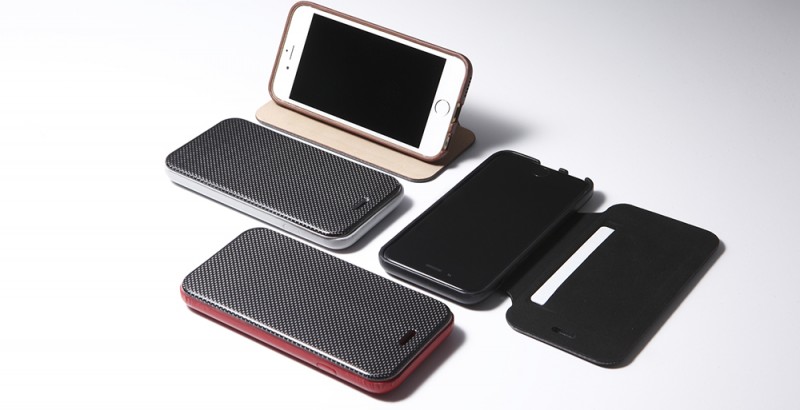カーボンファイバーと天然レザーを使用したiPhone 6用のフリップタイプケース。縫い目のないシンプルなフォルムと、全周囲を囲う完全カバーでiPhoneを保護