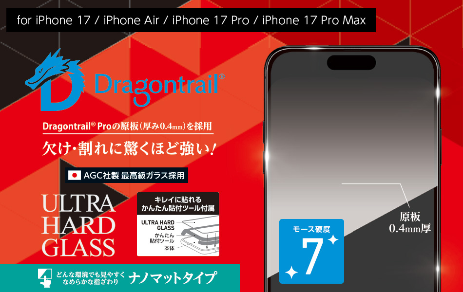 iPhone 17シリーズ用に、ガラス製スクリーンプロテクターを発売。9H以上の表面硬度をモース硬度と改めより強靱さを極めたUltra Hard Glass